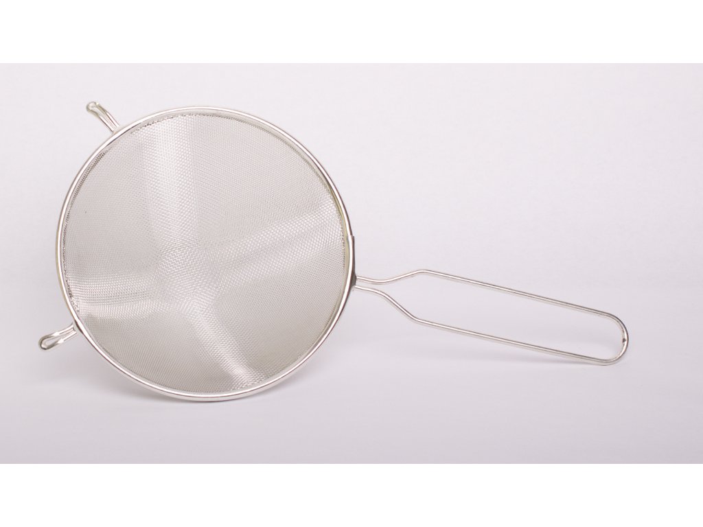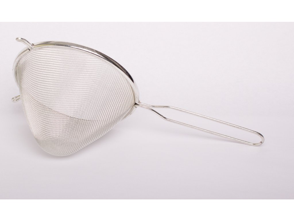 Cedník kužel, dobře zapadne např. do úzkého hrdla konve a podrží filtr na mléko. Jemné tkanivo s oky 0,7x0,7mm. Hloubka 10cm konický.