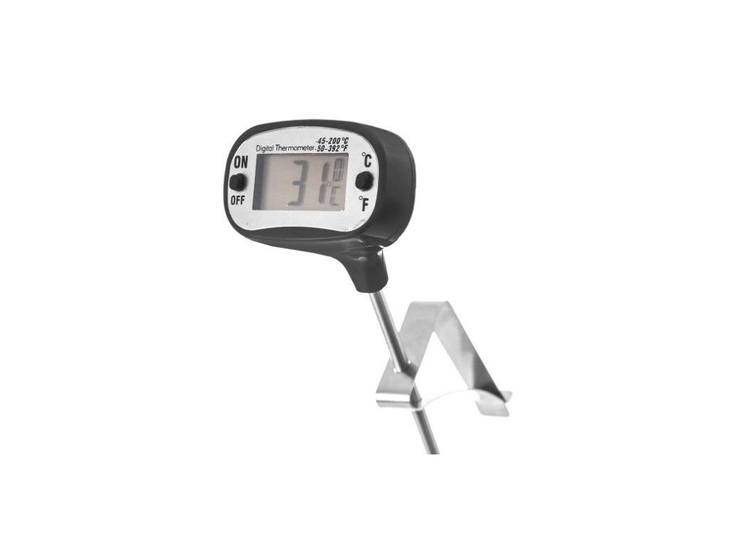 Vpichovací digitální teploměr s displejem orientovaným pro odečet shora. S kovovým klipem pro možnost uchycení na nádobu.